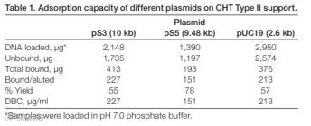 Bio-Rad 研发部门采用 CHT II 20um 装填到1ml 的层析柱中,然后对质粒样品 pS3(10Kb)pS5(9,48Kb)pUC19(2.6Kb)进行了纯化。