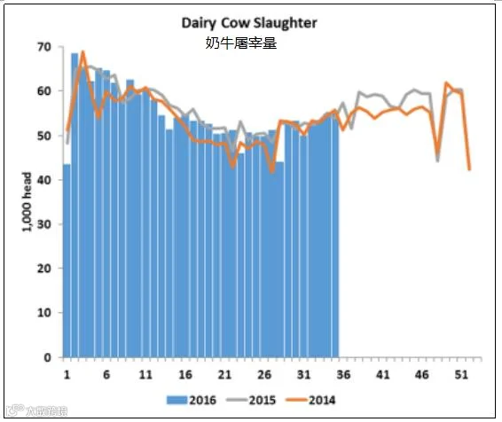 本周截至8月27日,奶牛屠宰量总计55,025头,比3月份以来的任何一周都要高,而且比去年同期增加了2%。今年至今,屠宰率比2015年下降1.4%。