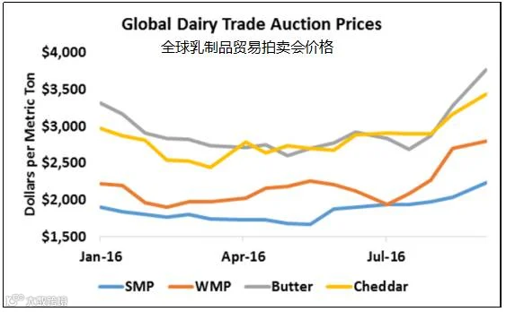 本周全球乳制品贸易(GDT)拍卖上的活跃表现进一步刺激了全球乳品市场。基于GDT指数8月上涨6.6%,收益率达到12.7%,本周二GDT指数攀升7.7%。所有乳制品价格均走高。无水乳脂价格增长最大,比上次拍卖会上涨15.4%以上。黄油的价格增长率紧随其后,增长了14.9%。连脱脂奶粉(SMP)价格也意外地增长了10%,全脂奶粉(WMP)价格反弹,回升了3.7%,切达奶酪价格上涨9%。