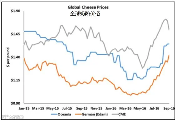 尽管库存量之大已经打破纪录,但美国奶酪相对全球供应仍持有相当的溢价。然而,与一年前相比,影响力已经减半。总的来说,全球的乳制品交易商正在指望产量不足,引起牛市咆哮。在芝加哥,人们交易变得更加谨慎。他们必须面对一个规模仍在扩大的巨型奶场以及有庞大的乳制品库存的问题。如果人们的观点不改变,美国和全球的奶酪差价就有可能进一步缩小。