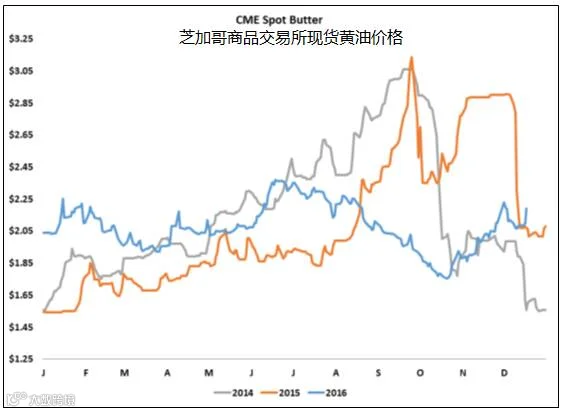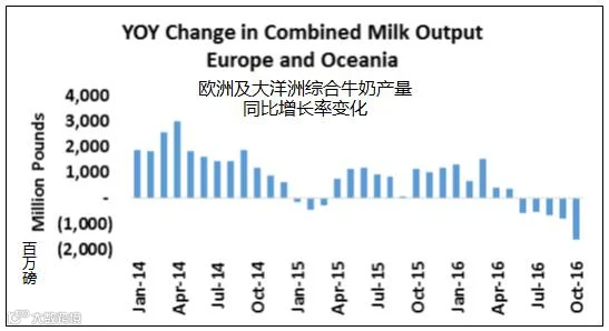 与去年10月相比,欧洲和大洋洲的牛奶产量合计减少了16亿磅。减产的数量在过去的几个月中不断地加大,足以消除今年上半年产生的大量盈余。在美元走强的情况下,中国和南美洲的牛奶产量赤字不仅加大了全球产量下滑,而且依然增加了美国乳制品出口的机会。美元在本周达到十三年来的高位,减少了美国乳制品出口的竞争力。不过,伴随着海外输出的减少,美国乳制品的贸易平衡可能会在2017年有明显的转变。这有助于使得需求量超过持续增长的美国牛奶供应量。