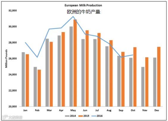 牛奶的产量在欧洲有所减少。10月的产量与去年同期相比下降3.5%,已少于265亿磅。10月德州牛奶的产量有超过近9.57亿磅的缺口。不管是以定值还是百分比计算,这都是数十年来欧洲牛奶产量同比下降最大的一次。这些数据都是来自于欧洲委员会的原始有效数据。(奥地利和塞浦路斯尚未公布10月份的牛奶产量;假设欧盟的28个国家的产量维持九月的同比变化。)10月是欧洲的牛奶产量持续同比下跌的第五个月以及是受欧盟委员会的牛奶产量削减计划影响的首月。持续的经济损失和低产奖励政策都明显的鼓励了生产商减产。