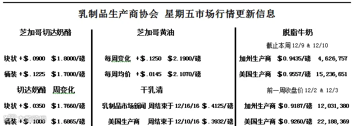 伴随着需求逐步加大,乳制品市场开始变得火热。芝加哥商品交易所黄油的价格在今天飙升9.5美分,收于2.19美元/磅,在一周内上升12.5美分。三月至五月的黄油期货价格高企,每天都刷新最高成交价格。现货脱脂奶粉(NDM)价格上升4.75美分,收于4.75美元/磅,这是自2015年3月以来的市场最高价。四级奶的明年上半年的合同收益在从40美分到近70美分的范围内。大多的合约价格都创造了新的价格高位。这样的回升将有助于提高乳制品生产商的信心,为不景气的市场带来一个令人振奋的结尾。