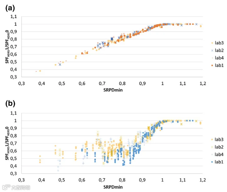 对于LED-HDRS实验室的ALT-SPF(替代性防晒系数)数据,以SPFHDRS1/SPFHDRS0比值展示的校正效果如下:(a)使用公式对所有样本进行的T值校正;(b)依据ISO 23698标准,针对SRPD(皮肤色素沉积相关光谱响应)进行的A值依赖性校正。