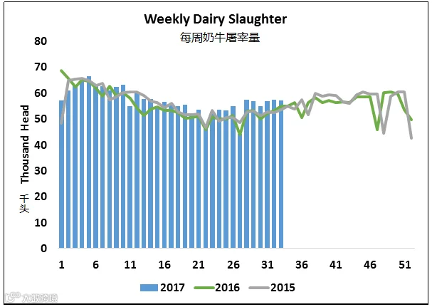 三级奶和四级奶的期货价格在明年上半年将处于低至15美元高达16美元之间。由于饲养成本低,一些乳制品生产商将能够使这些费用发挥作用,但繁荣将转瞬即逝,许多生产商将与面临赤字抗争。自上一次大繁荣以来已经过去很久,银行账户的缓冲度大大低于几年前的水平。在经过十八个月的持续膨胀,这些艰难的时光可能提供一个痛苦但必要的机会来整顿这个摔过跤的行业。事实上,屠宰量表明可能已经进行整顿了。截止至8月19日当周,屠宰量与去年同期相比涨幅高达4%,这是近年来的最大的同比增长率。2017年的屠宰率与2016年相比涨幅3.5%。