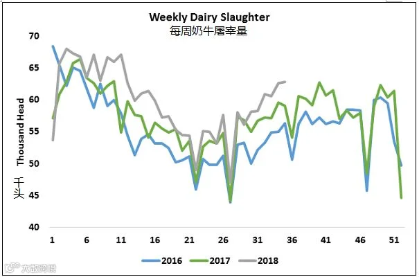 屠宰量也显示乳制品生产商的数量正在增加,这导致了奶牛群的持续下降。截至9月1日的一周,奶牛屠宰量为62,859头,去年同比增长6.4%。奶牛屠宰量连续4周突破6万头。自1986年牛群整体收购和宰杀计划以来,每年这个时候,都没有屠宰过这么多奶牛。东部的恶劣天气和减少的奶牛数量肯定在夏天转到秋天的时候抑制了牛奶产量。