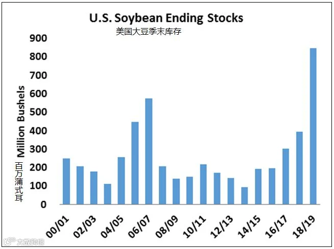 美国农业部还提高了对大豆产量的预估,但这种变化大多是预料之中的。美国农业部将大豆的产量的预估提高至52.8蒲式耳/英亩,总产量为46.9亿蒲式耳,创历史新高。尽管供应量增加,但美国农业部预计,由于中国关税对美国前景构成压力,出口量将从前两个季度的可观的数量下滑。预计美国大豆库存总量将达到8.45亿蒲式耳,这是迄今为止最大的季末库存。