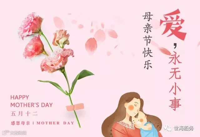 无怨无悔是母亲的付出,丰收硕果是母亲的微笑,澎湃江海是母亲的辛劳,深情似地是母亲的厚爱!有一种爱大公无私,有一种爱无怨无悔,这是伟大的母爱。母亲节到了,世海船务祝天下母亲幸福、快乐、健康!
