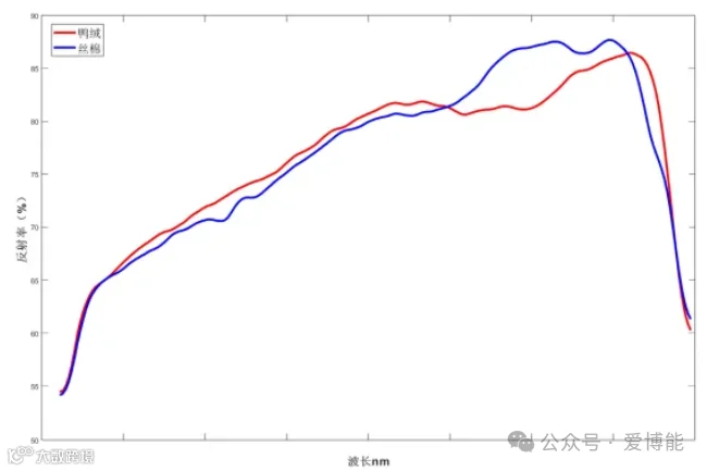 通过对两组样品的高光谱数据进行分析,发现真鸭绒和仿绒制品在NIR光谱曲线的两个波长范围内存在显著差异)。这些差异表明两组样品的物质成分存在较大区别。
