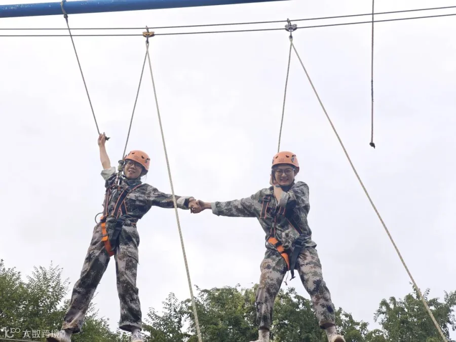 拓展场上,高空挑战尤为触动人心。当学员们站上数米高的平台难免心生胆怯,而此时队友纷纷仰首鼓励,“稳住,你能行!”“加油,你可以!”,此起彼伏地响彻训练场。声声呼喊汇聚成温暖力量,驱散畏惧,激荡勇气,被鼓励的学员凝神聚气,奋力纵身一跃——这一跃,是对自我的突破,更是对团队信任的回应。