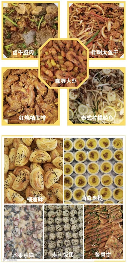 本次美食节菜系丰富,味道浓郁,以韩国和东南亚美食风味为特色,主打咖喱大虾、泰式柠檬鱼、榴莲酥等东南亚美食,精心推出芝士爆香鸡、拌明太鱼、金枪鱼和鱼籽饭团等韩式特色美食,当然也少不了传统的中式家常菜品,卤牛腱子肉、红烧精肋排、荷塘小炒、素炒娃娃菜,搭配烧仙草、水果沙律等甜点。