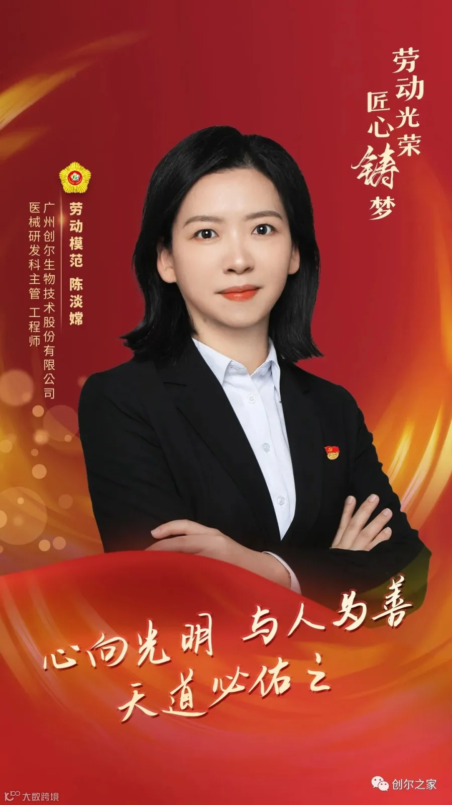 劳动光荣,匠心筑梦,望公司全体人员向陈淡嫦学习不怕苦不怕累劳模精神,扎扎实实,兢兢业业,突破创新,为创尔的发展努力奋斗!以“心向光明,以人为善,天道必佑之”的信念,去闯、去试,未来必然更加阳光明媚!