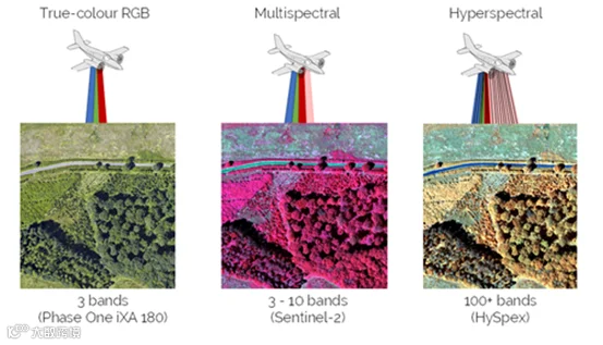 全彩、多光谱和高光谱技术的比较,其中包括了波段数和仪器实例。