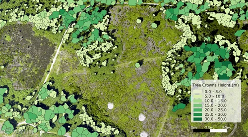 来自皇家鸟类保护协会保护区的一部分带有树高的树木分布地图