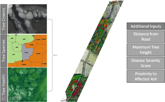 以白蜡树枯梢病分析为实例,沿着电力线使用机载高光谱图像来定位单个树木及其种类、高度和健康情况。把这些都结合起来,就可以得到最终的风险地图。