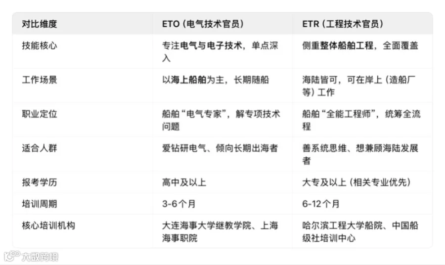 ETR和ETO是海事领域常见的两种专业证书,但许多人常常分不清二者的核心差异。本文将为你详细解析两者的职业定位、技能要求、培训路径及发展前景,助你选对适合自己的海事赛道。
