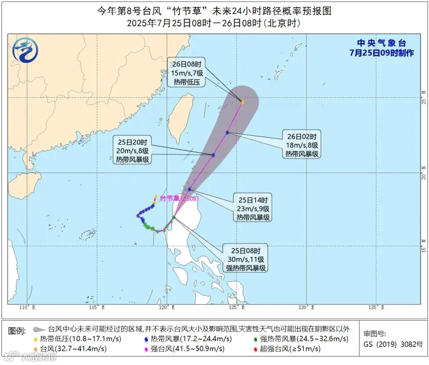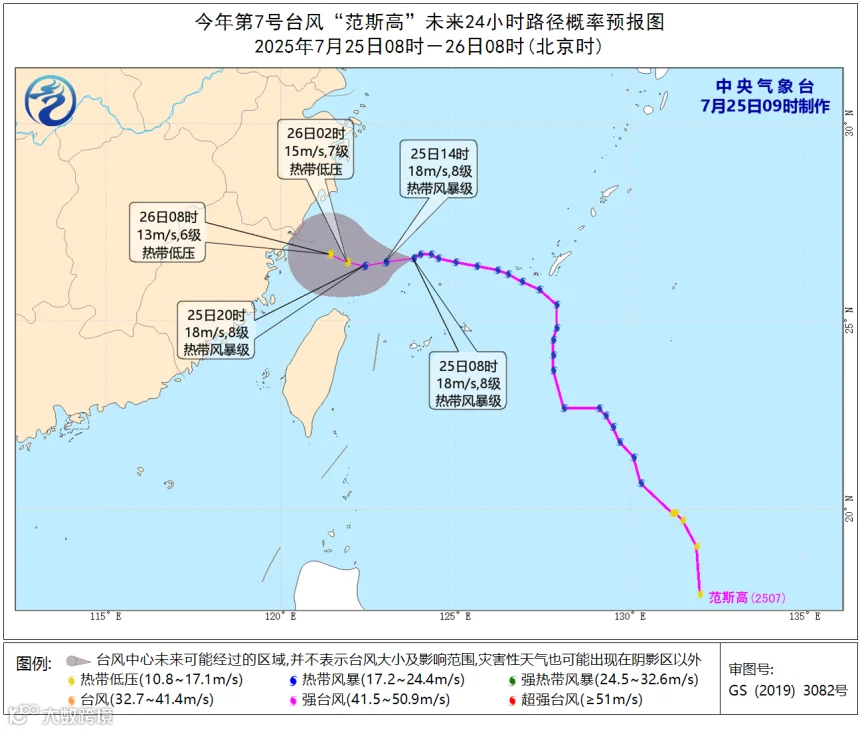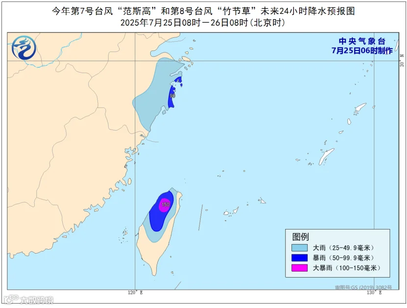 降水预报:7月25日08时至26日08时,受“范斯高”和“竹节草”的共同影响,浙江东部、台湾岛等地部分地区有大到暴雨,台湾岛北部部分地区有大暴雨(100~150毫米)。
