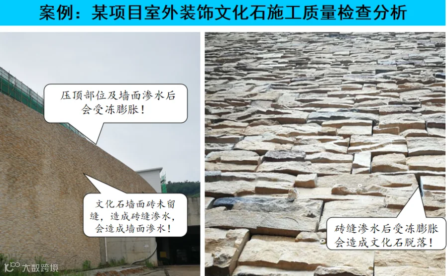 原因1:案例:文化石墙面砖施工基层处理不当及未留缝粘贴,砖缝渗水后造成墙面渗水,寒冷季节会造成文化石脱落,详见图-11-12。