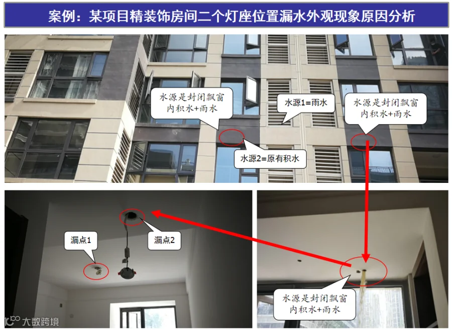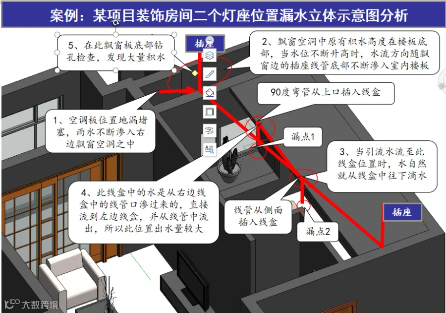 案例:外墙空调板内因地漏堵塞,加上空调板周边墙面防水处理不到位,造成雨水进入旁边的封闭式飘窗洞内,然后水位上涨后随楼板混凝土密实度薄弱位置的插座线管底部渗水至室内顶棚灯座,造成房间内顶棚严重漏水现象,漏水的外观现象原因分析见图-13,内部结构漏水的原因分析见立体示意分析图-14。