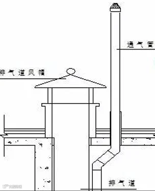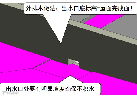防治措施:在排雨水出口处做防水时需将防水层铺设均匀不宜过厚,屋面放坡、排水沟及雨水口周围需提前做好坡度策划,确保雨水顺利排出。优化排布将卫生间透气管在预留时向外移动避免通气管靠墙近或穿越风帽等,通气管应绕开风帽最大边缘处留设套管或一次性预埋,见图-5,雨水篦子留置高度为洞底标高等于屋面完成面标高,见图-6。