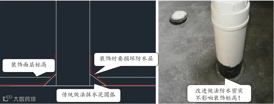 原因5、传统做法卫生间管根部分抹水泥砂浆圆弧做法,然后防水施工,当圆弧标高出现偏差时,装饰瓦工就会损坏防水层,造成渗水隐患,见图-20。