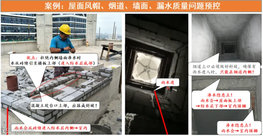 原因3:出屋面烟道砌筑未按设计及规范要求施工,未设置上翻混凝土坎台及烟道内侧墙体底部与楼板交接处未做好抹灰斜坡处理,排烟风道顶部与楼板交接处封堵不严及未做斜坡处理,造成渗水隐患,见图-1。