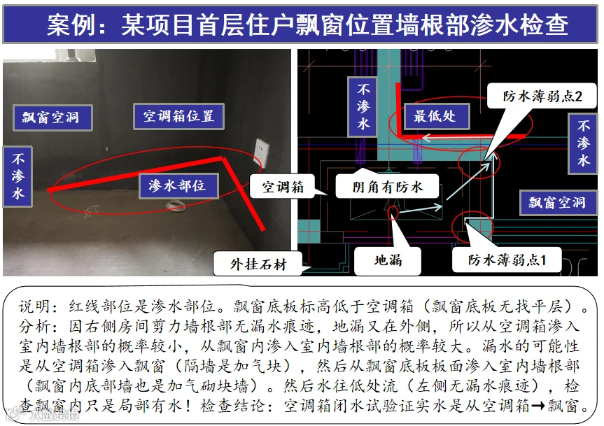 案例:首层住户飘窗位置墙根部渗水检查情况总结分析见图-15。