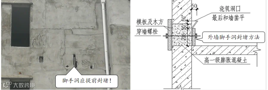 (1) 外墙脚手架洞未在抹灰前进行封堵,且封堵不密实会造成外墙渗水。