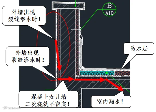 原因4:混凝土女儿墙施工时未与屋面板一次性浇筑,在二次浇筑时,女儿墙底部的屋面板施工缝处未凿毛处理,基层清理不到位等原因造成施工缝处出现混凝土不密实,当女儿墙外侧墙面出现裂缝时,将会存在女儿墙施工缝处出现渗水隐患,详见示意图-3。