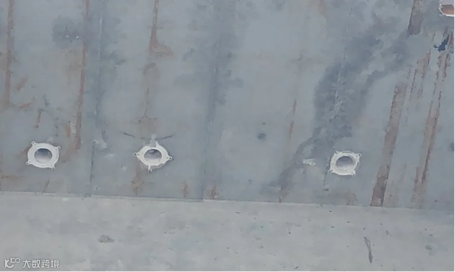 6)模板穿墙螺杆的防水处理。渗漏原因为止水片焊缝不饱满,局部有砂眼:
