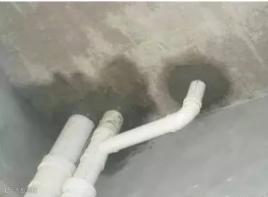 原因3、穿楼板管的预留洞口过大,造成填料过厚,填塞料收缩性较大,难以保证填塞密实,管道周围的基层未认真处理,降低了新旧混凝土之间的粘结力,从而导致管道周围的渗漏,见图-18。