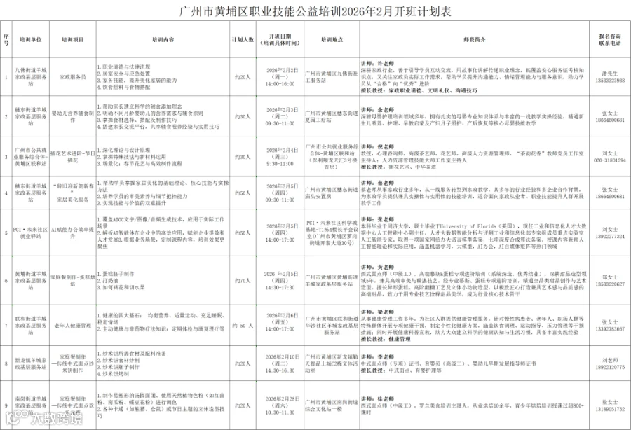 广州市黄埔区职业技能公益培训2026年2月开班计划表