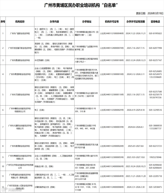 黄埔区人社局在“黄埔职建”公众号发布“黄埔区民办职业培训机构白名单”并动态更新,建议如有技能培训需求,优先选择名单内的机构咨询报名。