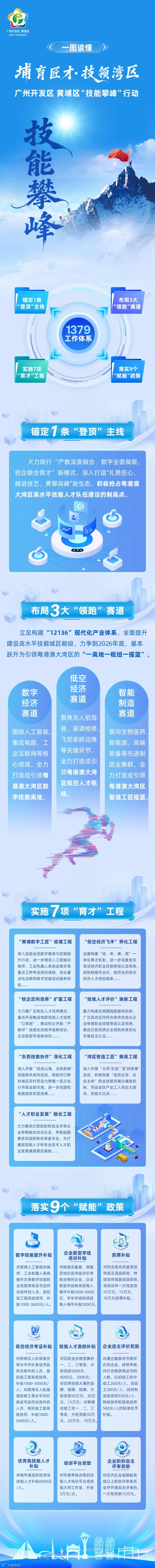 如何抢抓机遇、迎接挑战,主动拥抱智能时代?广州开发区、黄埔区在今年2月初已经给出答案。那就是立足投资于人,深入实施“技能攀峰”行动。目前,该行动正锚定“抢占大湾区高水平技能人才队伍建设制高点”主线,布局数字、低空、智造三大领跑赛道,实施数字工匠倍增、低空飞手孵化等七项育才工程,落实技能提升补贴、自主评审资助等九项赋能政策,全方位构建起“1379”技能人才培养工作体系,全面提升高水平技能城区建设能级,加快将广州开发区、黄埔区跃升为引领粤港澳大湾区的数字技能高地、低空人才枢纽、智造工匠摇篮。