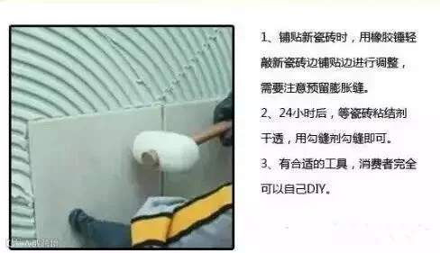 个别严重起鼓或损坏的瓷砖需要铲除,铲除后用面砖表面处理剂修补,与旧瓷砖表面一样平整后,再用瓷砖粘结剂粘贴新瓷砖,更牢固。