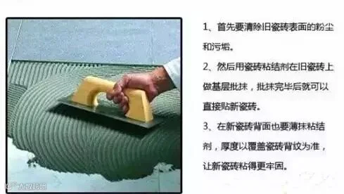 厨房和卫生间墙地面无论为何种瓷砖,都可以在旧瓷砖上直接贴新瓷砖。首先要清除旧瓷砖表面的粉尘和污垢,然后用瓷砖粘结剂在旧瓷砖上做基层批抹,批抹完毕后就可以直接贴新瓷砖。建议,在新瓷砖背面也要薄抹粘结剂,厚度以覆盖瓷砖背纹为准,让新瓷砖粘得更牢固。