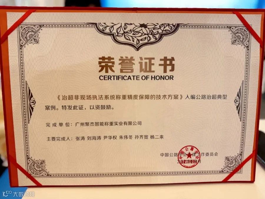 本次大会上,聚杰智能《治超非现场执法系统称重精度保障的技术方案》入编“公路治超典型案例”,并获荣誉证书。