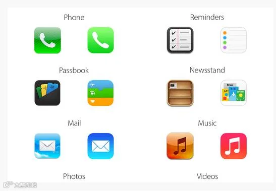 这里是iOS6和iOS7苹果的图标之间的比较。