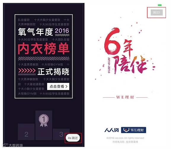推广要点: 可以作为品牌广告、APP活动、功能点展示等的推广渠道(比如上图中氧气APP启动页年终盘点活动的推广,人人贷APP6周年庆典的品牌推广);因为APP启动页只有短短几秒的显示时间,也只能设置一个展示页面,所以必须把控好文案和整个页面设计。