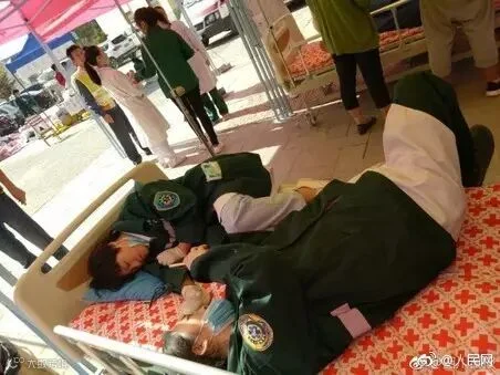 九寨沟县第二人民医院,忙碌一宿的医护人员,席地而睡,短暂休息,很快又将投入新一轮的救援