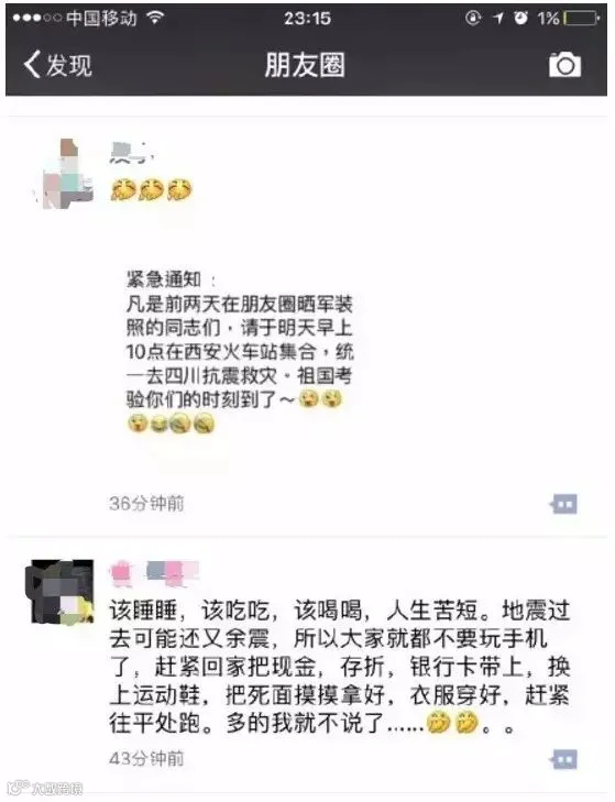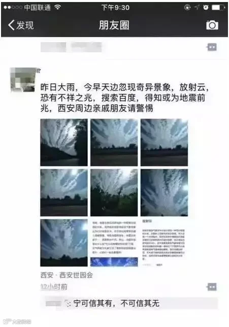 最早传的一波,是地震云的谣言。说某某中学的老师在地震事发前就曾经发朋友圈,预测九寨沟方向可能会有地震: