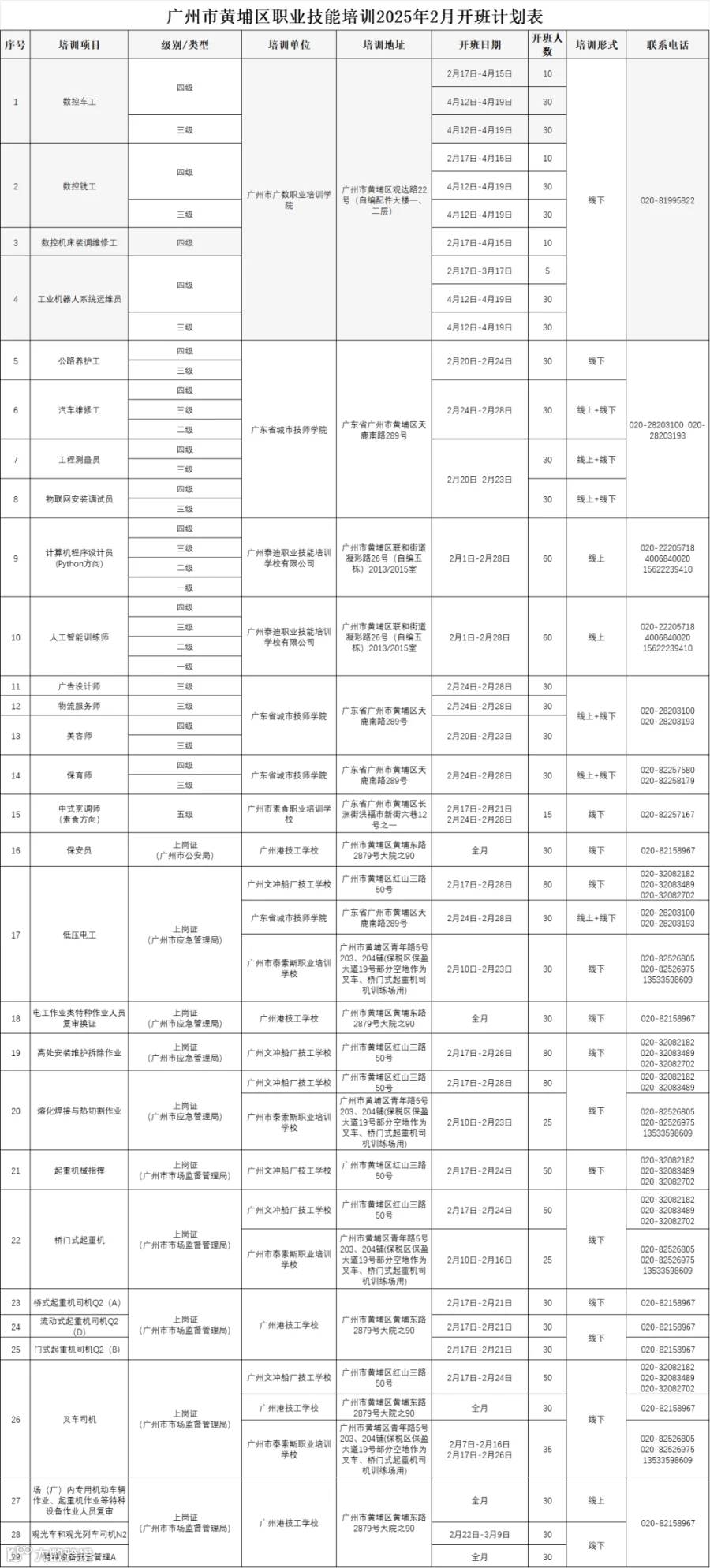 广州市黄埔区职业技能培训2025年2月开班计划表