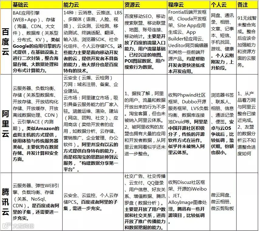 相对于阿里倾向于Amazon的思路——转租基础设施(以IaaS为主,也有部分PaaS),百度云更倾向于Google的思路,在基础设施上封装服务(PaaS+SaaS)。在面向开发者的云服务上,百度拥有LBS、云测试之类的独家能力。在语音和图像识别、智能推荐、深度学习、大数据挖掘和预测等新兴技术方面,也几乎无人能敌,这些都是应用层面的能力。