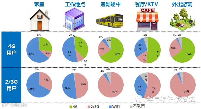 在餐厅/KTV等公共WIFI覆盖的地方,4G用户中选择运营商网络的比例要高于2G用户。在这些场所,4G在快速、便捷等方面相对WIFI具有一定优势。