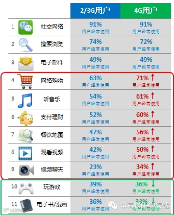 经常使用社交网络、电子邮件、搜索浏览的4G和2/3G用户比例接近,因为此类需求比较刚性,网络条件改善对它们影响不大。