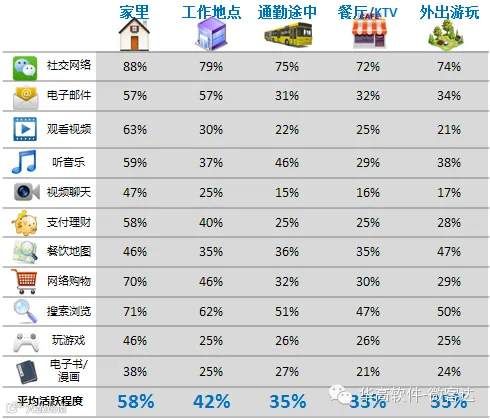家是用户使用各种应用最为活跃的场所,其次是工作地点。