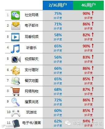 4G用户对各类应用体验好评度的提升都非常明显。