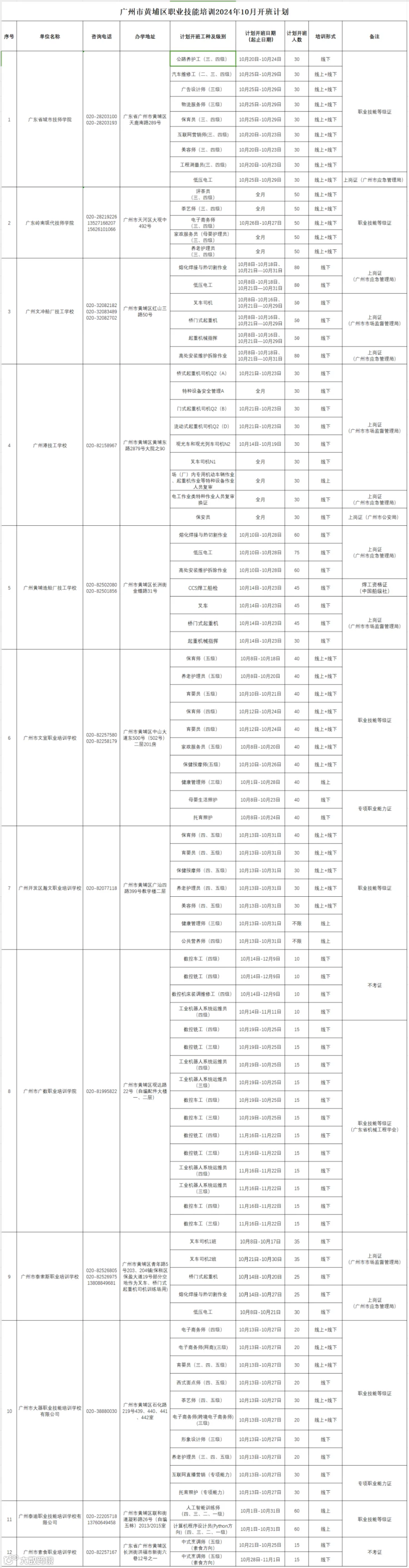 广州市黄埔区职业技能培训2024年10月开班计划通知