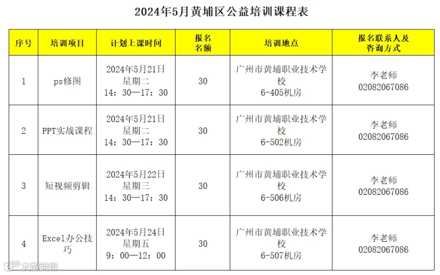 为优化区域人才培养模式,强化职业技能培训公共资源供给,更好满足区内劳动者参加职业技能培训需求,助力企业建设高技能人才队伍,促进我区经济社会高质量发展,黄埔区人社局将联合黄埔职业技术学校面向社会推出系列免费公益培训课程,课程计划每月推出一期,欢迎我区广大劳动者免费报名参与。