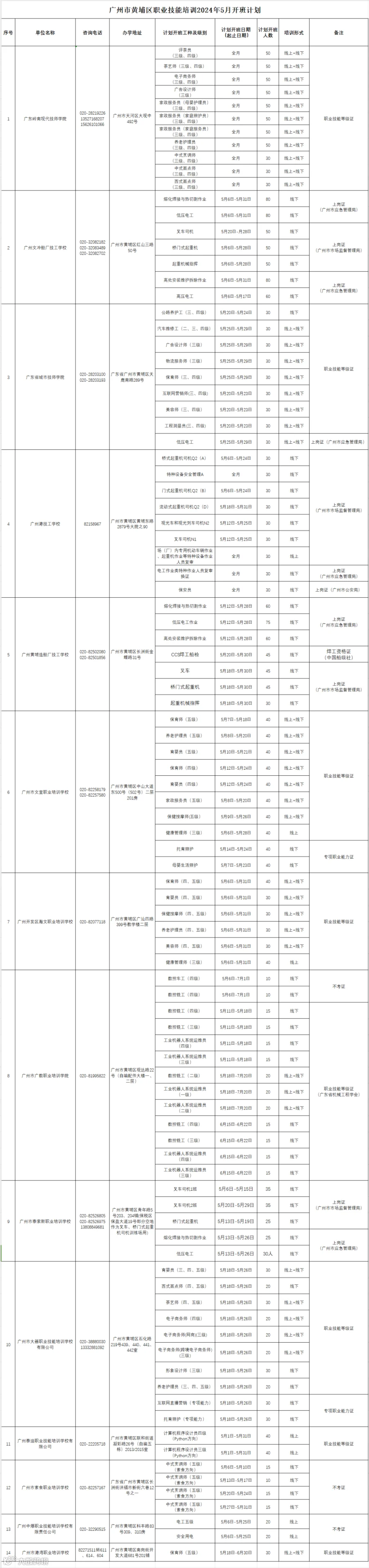 广州市黄埔区职业技能培训2024年5月开班计划通知